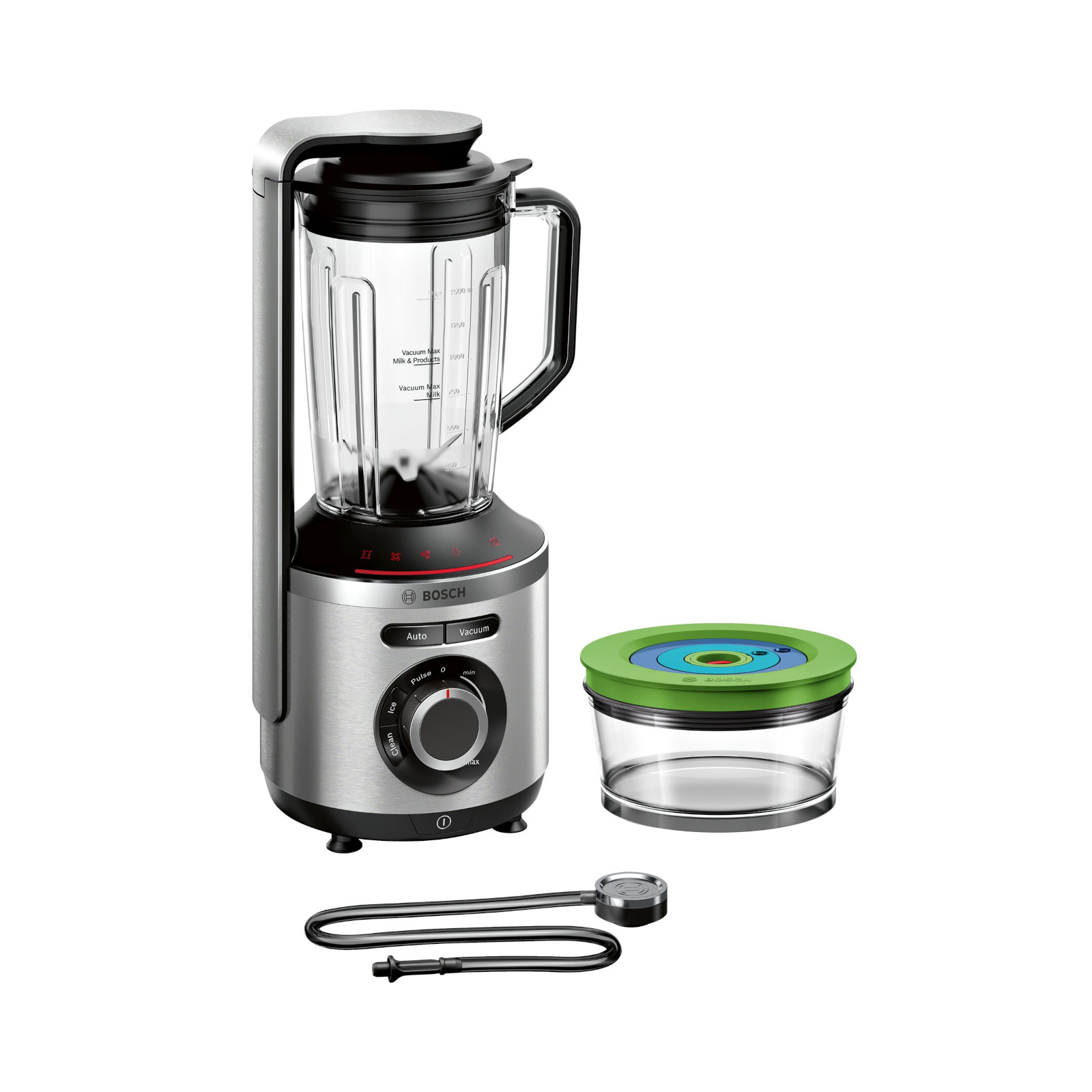 - Recipiente para almacenar al vacío (0,75 l). Conserva los alimentos frescos hasta 2 veces más de tiempo.