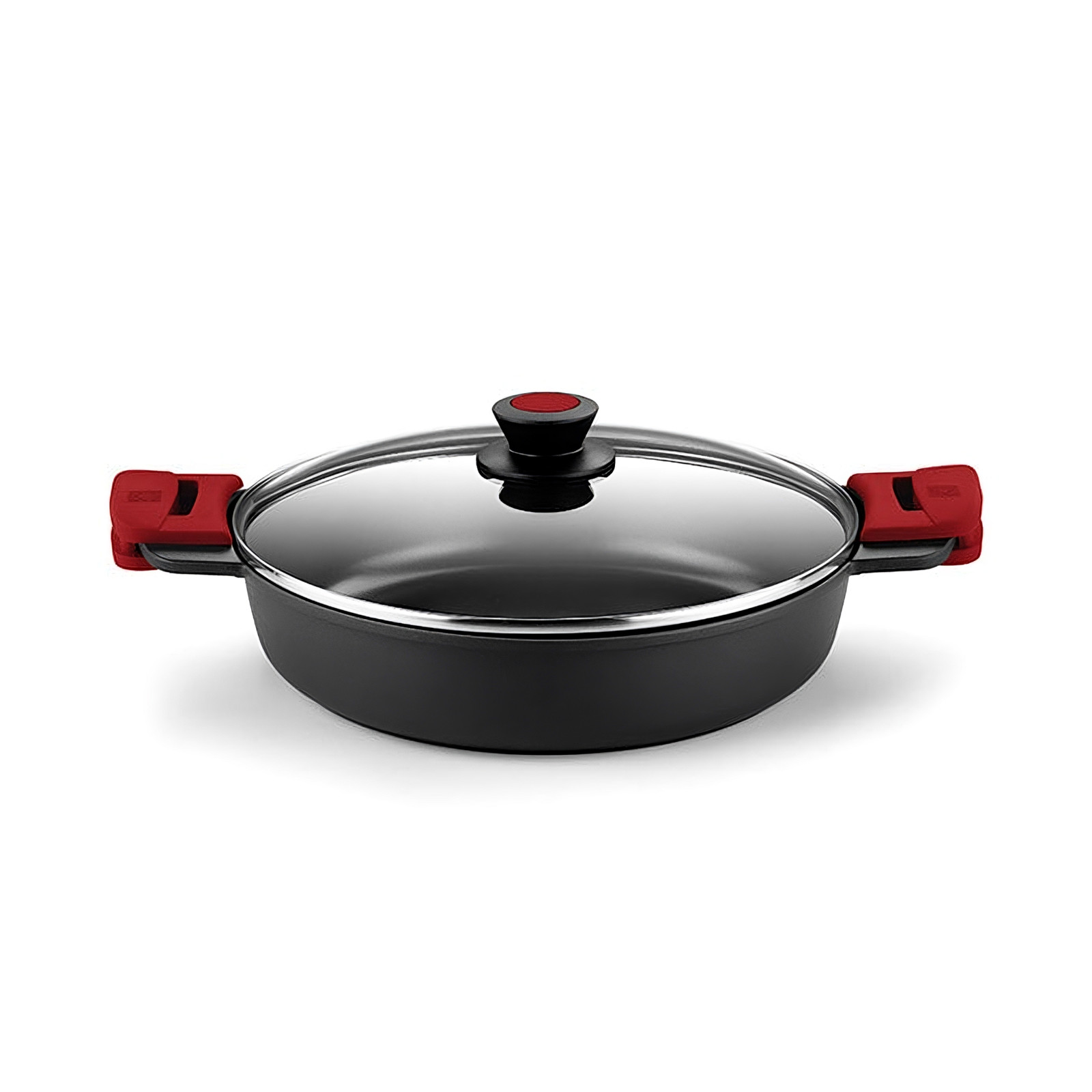 Incluye tapa de cristal con pomo termo resistente y dos asas de silicona en color rojo, que puedes quitar muy fácilmente para poder introducirla también en el horno.