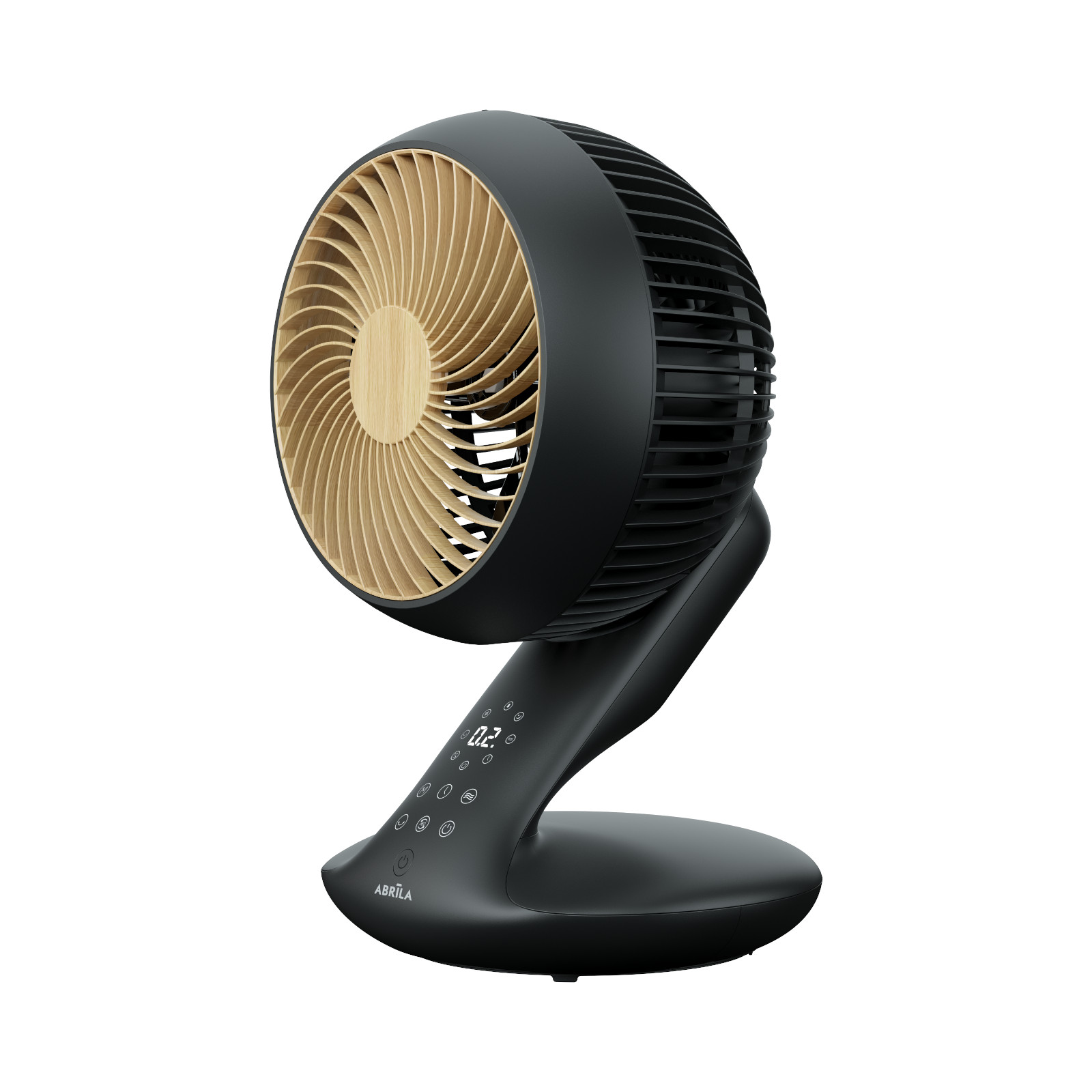 Ventilador de sobremesa de la serie MIERA en color NEGRO/HAYA. Realizado en metal, ABS y policarbonato. Motor DC, con 20 watios de potencia, ocho velocidades, con dos posiciones, fijo y rotatorio, con oscilación 3D: movimientos derecha-izquierda y arriba-abajo automáticamente, y con cuatro modos de aire: NORMAL-NATURAL-SUEÑO Y ECO, para poder elegir la mas adecuada en cada momento, además, con el sistema ECO que aminora o aumenta la velocidad de sus aspas dependiendo de la bajada o subida de temperatura puede conseguir su comodidad y un gran ahorro de energía. Diseño muy moderno y original, de fácil manejo, su panel de control es TÁCTIL y viene con DISPLAY, MANDO A DISTANCIA incluido y TEMPORIZADOR pudiendo programar su apagado automático transcurridas hasta 8 horas. Tiene unas dimensiones de 40,5x25,4x23,3 centímetros. Ideal para todo tipo de habitaciones tanto como sobremesa como en suelo y fácil de transportar.
